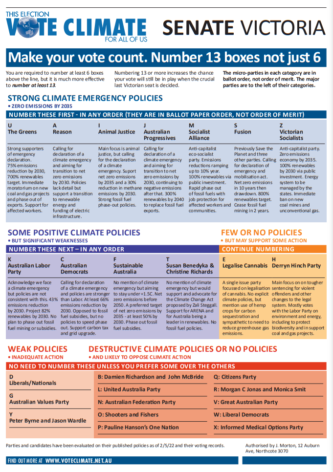 You can also check the ratings of the senate candidates at Vote Climate One or Vote Earth Now. These guides use somewhat different methodologies to Vote Climate as they rely partly on unpublished questionnaires, while we rely only on published policies. However, these other sites come to very similar conclusions about which parties and candidates to recommend.